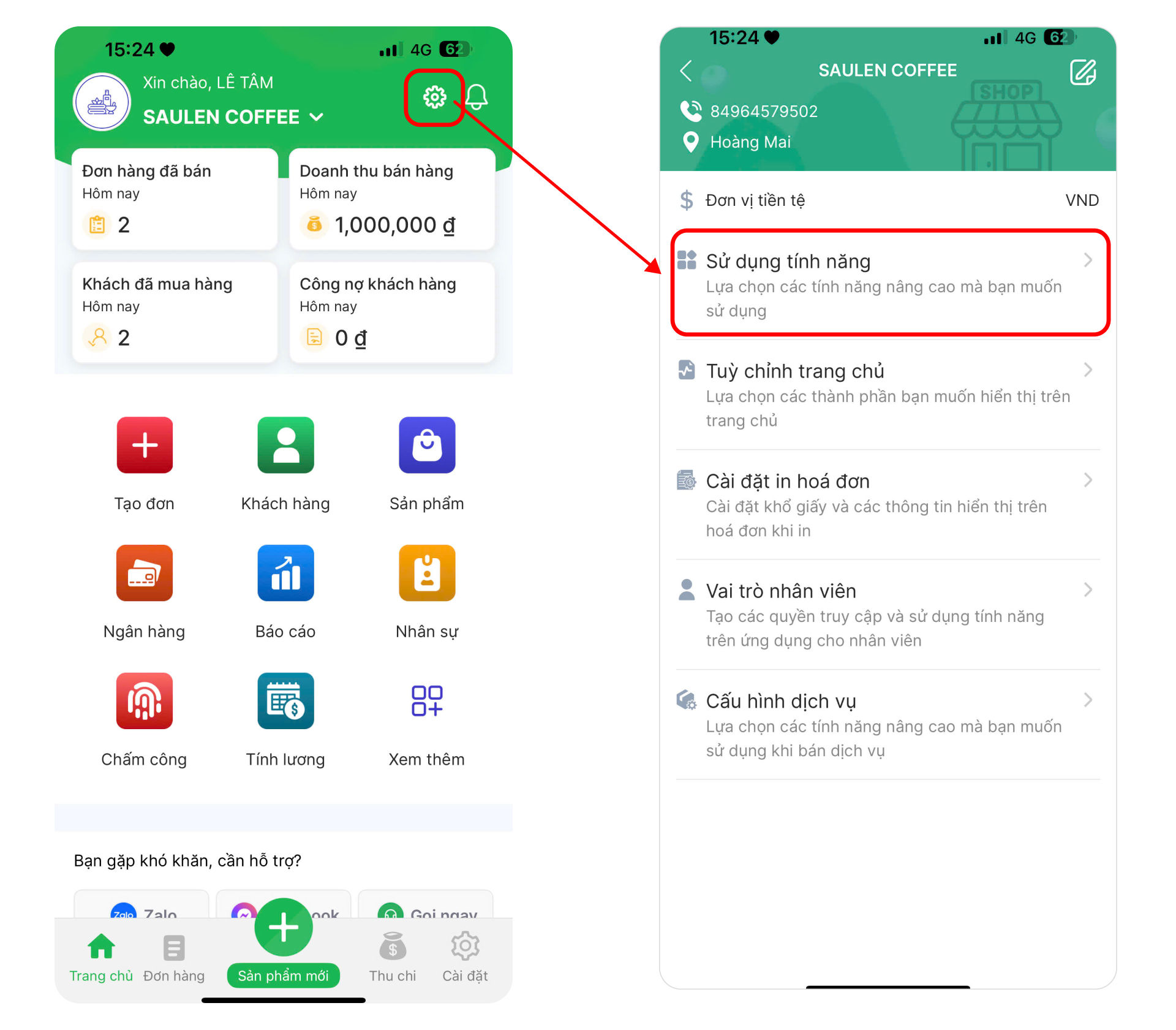 Tại màn hình chính chọn icon “Cài đặt” → Màn hình hiển thị danh sách cấu hình → Chọn “Sử dụng tính năng”