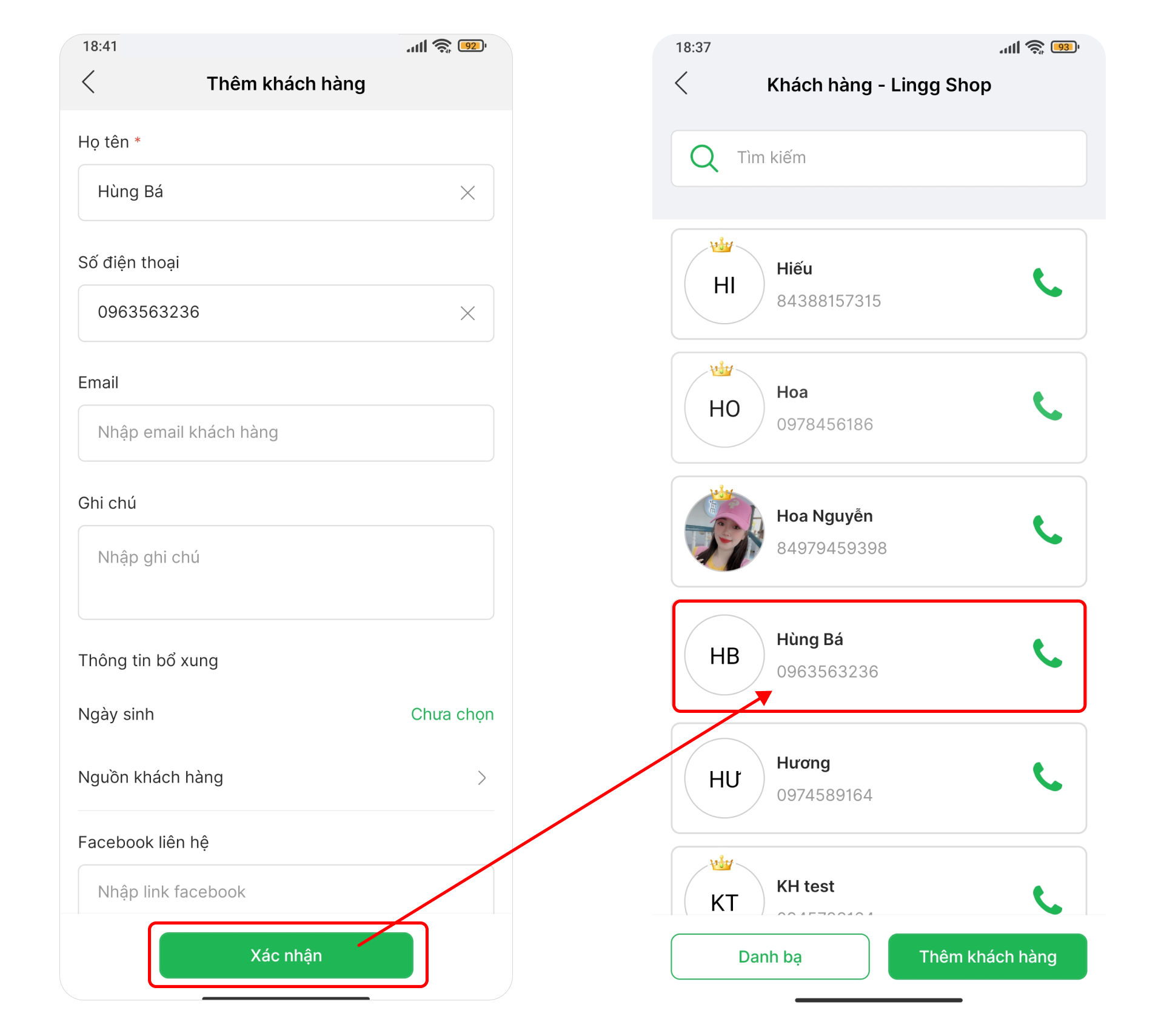 Sau khi nhập xong các thông tin cần thiết → Chọn “Xác nhận”, màn hình hiển thị thông báo thành công và khách hàng đã được thêm mới