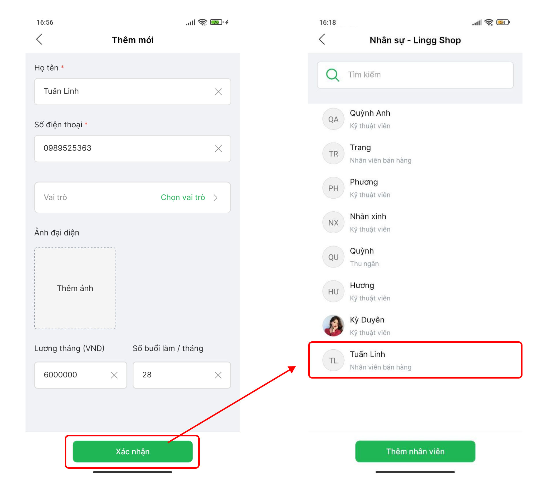 Sau khi hoàn thành chọn "Xác nhận" → Màn hình hiển thị thông báo thành công và nhân viên đã được thêm mới