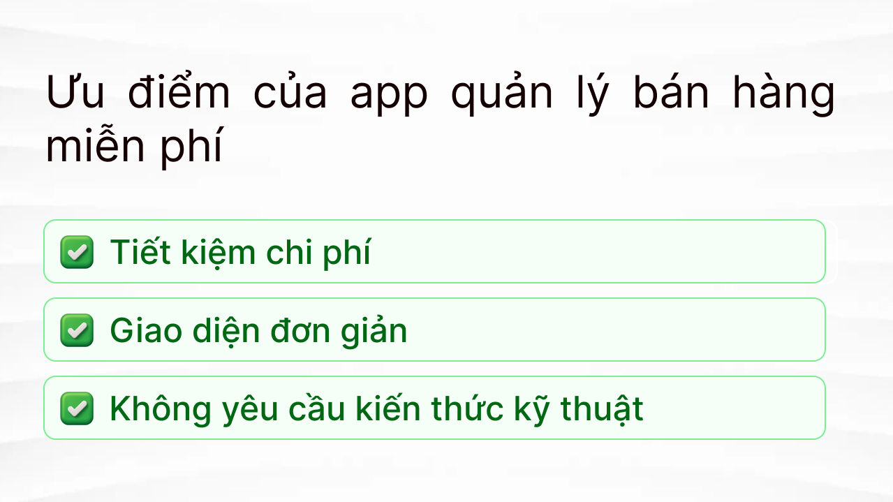 App quản lý bán hàng miễn phí thường hấp dẫn vì: Không tốn tiền ban đầu, dễ cài đặt, dùng ngay và phù hợp với shop mới mở, bán ít sản phẩm