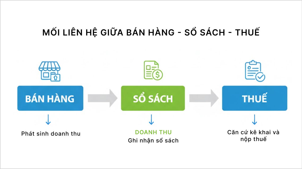 Vậy phần mềm bán hàng có thực sự giúp giảm rủi ro sai thuế hay không? Câu trả lời nằm ở mối liên hệ chặt chẽ giữa bán hàng - sổ sách - thuế.